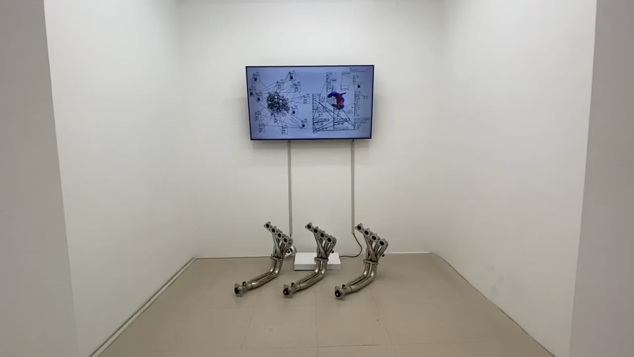 single channel video, exhaust manifold, speakers